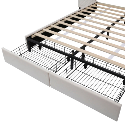 Velvet Upholstered Double Bed With Storage Drawers & Headboard Side Pockets