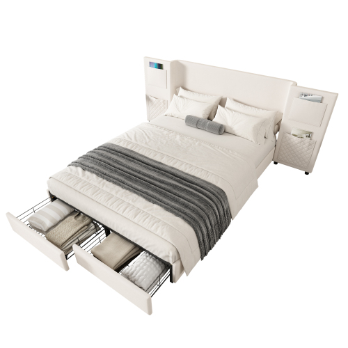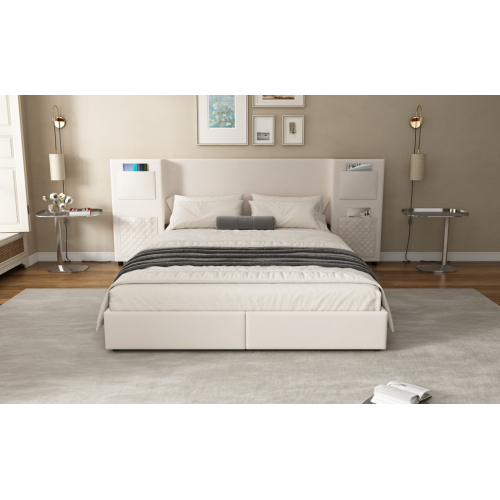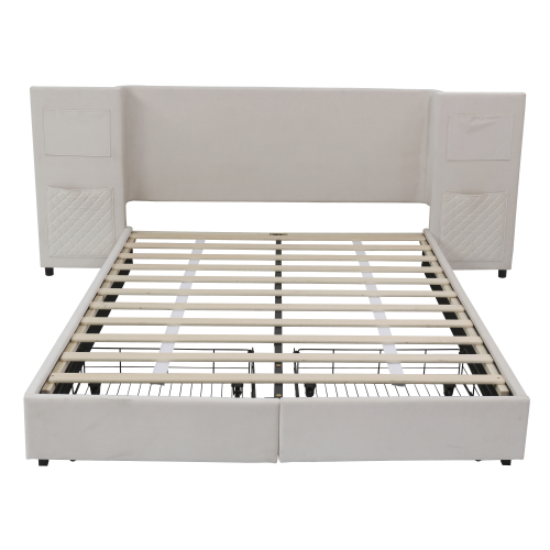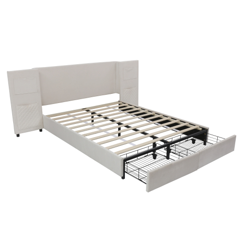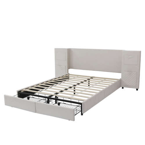 Velvet Upholstered Double Bed With Storage Drawers & Headboard Side Pockets