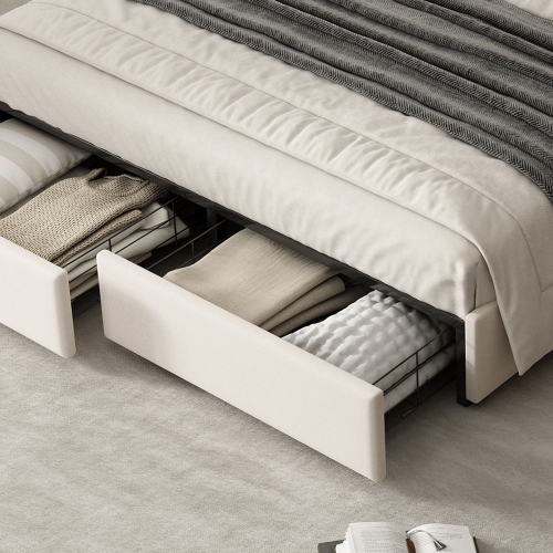 This upholstered bed is recommended for mattresses 135x190 cm (4ft6) and less than 20 cm thick. This bed is a perfect blend of durability, functionality, and comfort, designed to elevate any bedroom with its practical and stylish features. Crafted with a sturdy bed frame and robust iron bed legs, it ensures long-lasting stability and reliable support for a restful night’s sleep. Convenience meets organization with small storage pockets on both sides of the headboard—ideal for keeping bedtime essentials like books, glasses, or phones within easy reach. Under the bed, two large drawers with smooth-rolling wheels offer ample hidden storage space, perfect for tucking away extra bedding, pillows, or seasonal items to keep your room clutter-free. Comfort takes centre stage with its soft, padded headboard and luxurious velvet surface, adding a touch of elegance while providing a cosy spot to lean back and relax. Versatile in design, this bed seamlessly complements various decoration styles—whether modern or classic—making it a timeless addition to any bedroom.